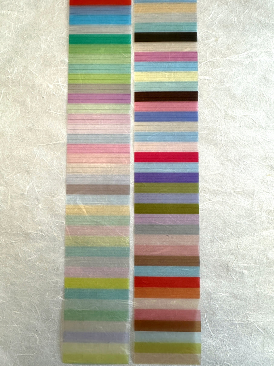 These are colorful, ultra-slim strips that can be used as highlighter lines, when placed over printed text. The tape width is 5 cm, but the strips are cut to varying lengths.
