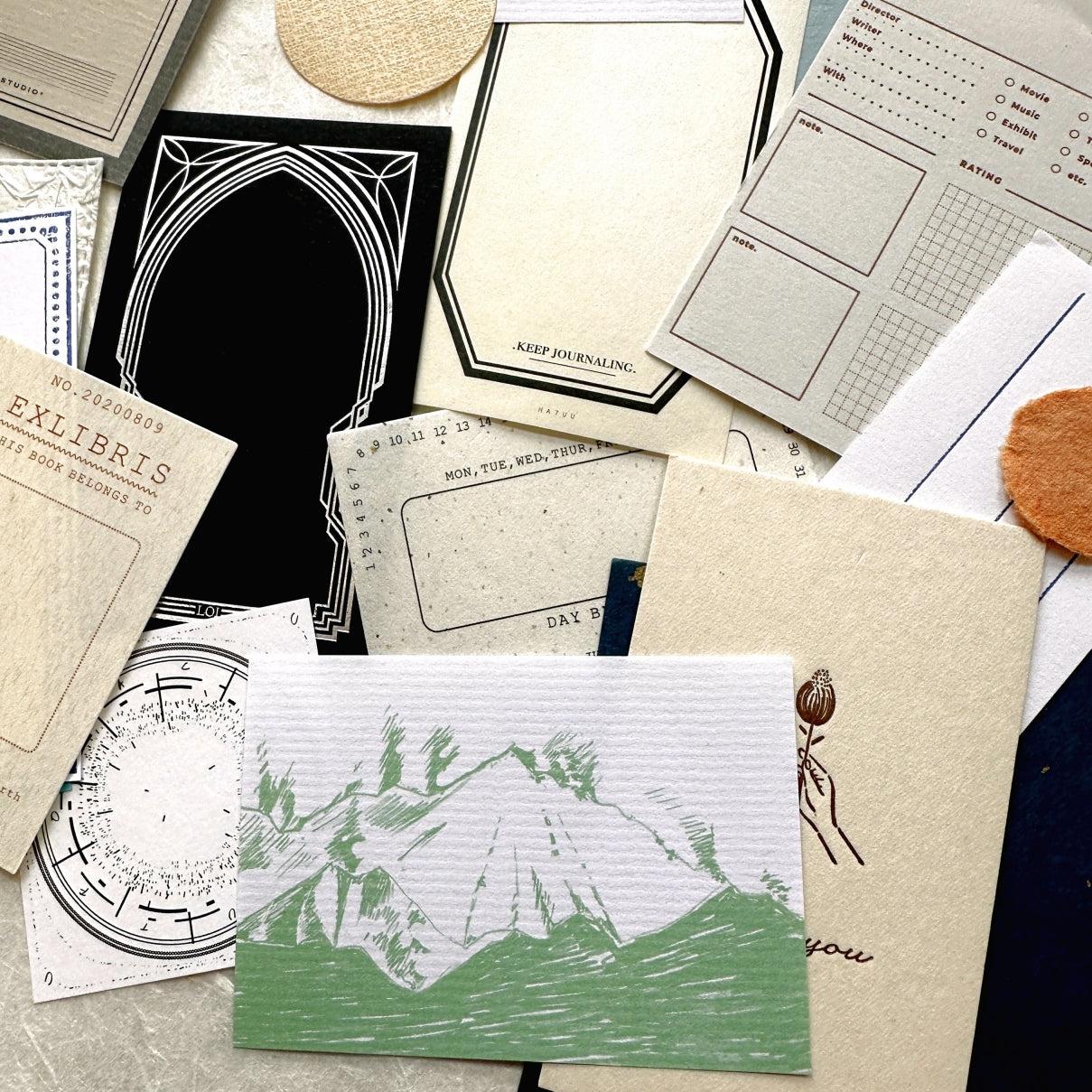 Every sampler will have (at least) 25 different pieces and may include any of the following: letterpress label cards, perforated note papers, memo papers, handmade paper coins or mini sheets, collage ephemera, printed tracing paper sheets, textured specialty paper, and more.