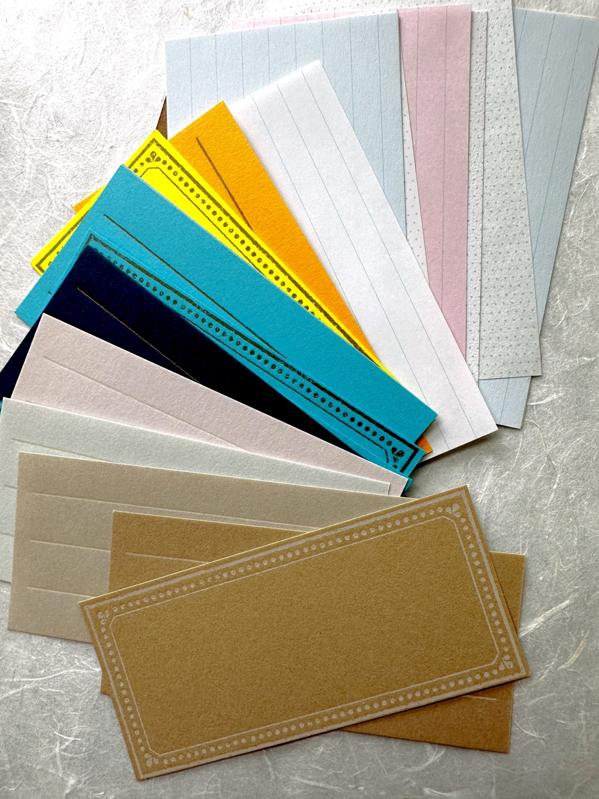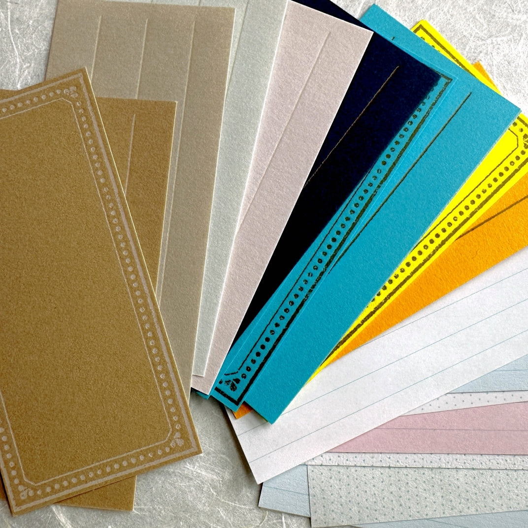 These papers are all from Yamazoe's "Letter Press Box - Message Card" sets from recent years. Each year's box sets came with different colors. Material: paper in assorted colors.
